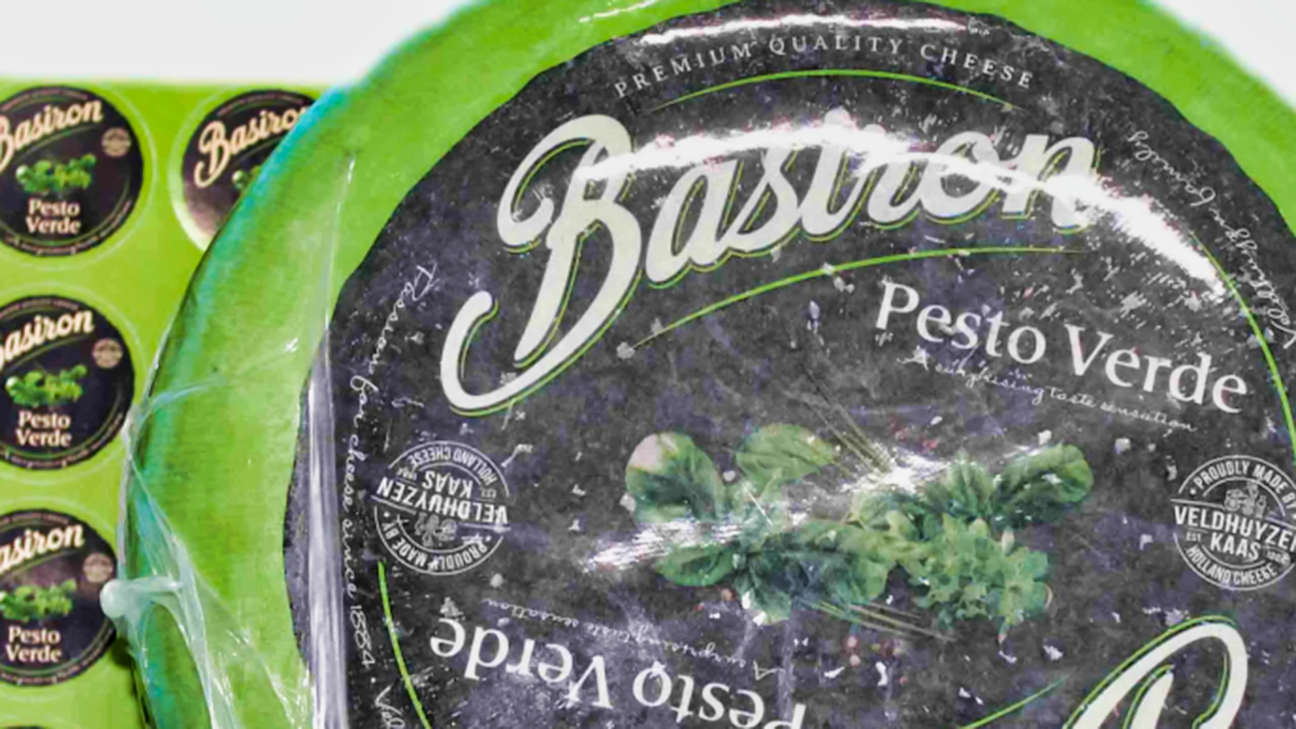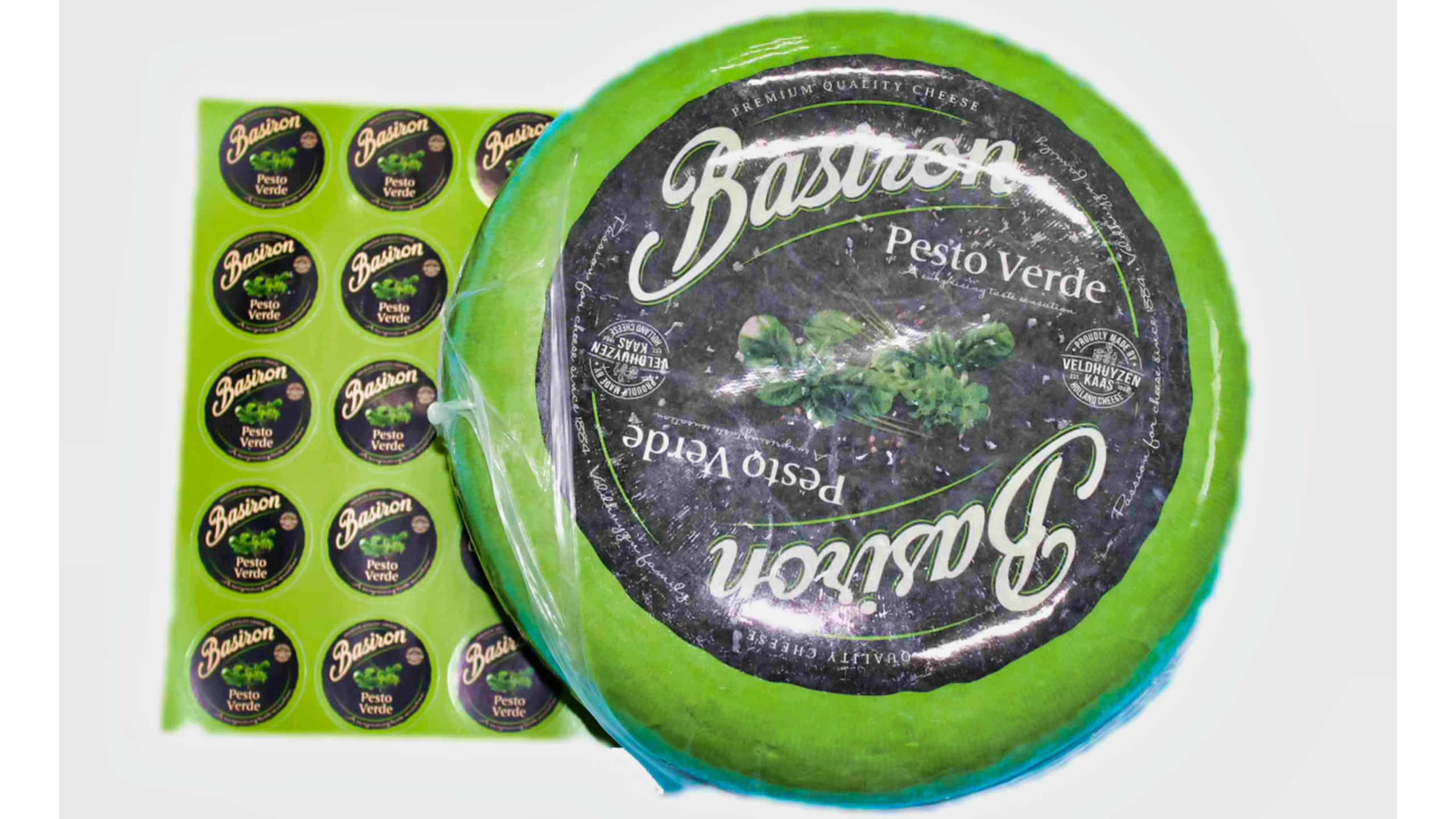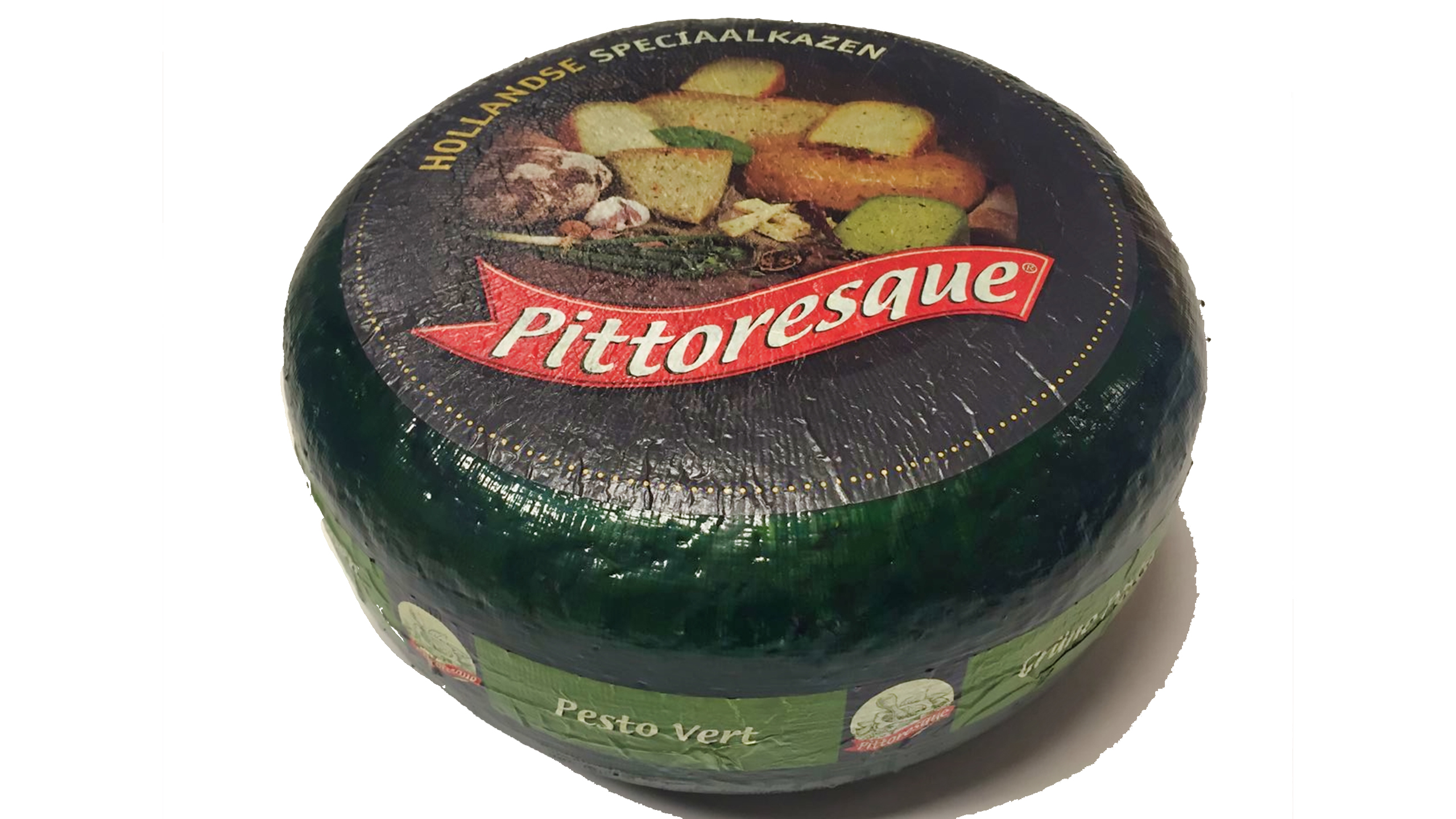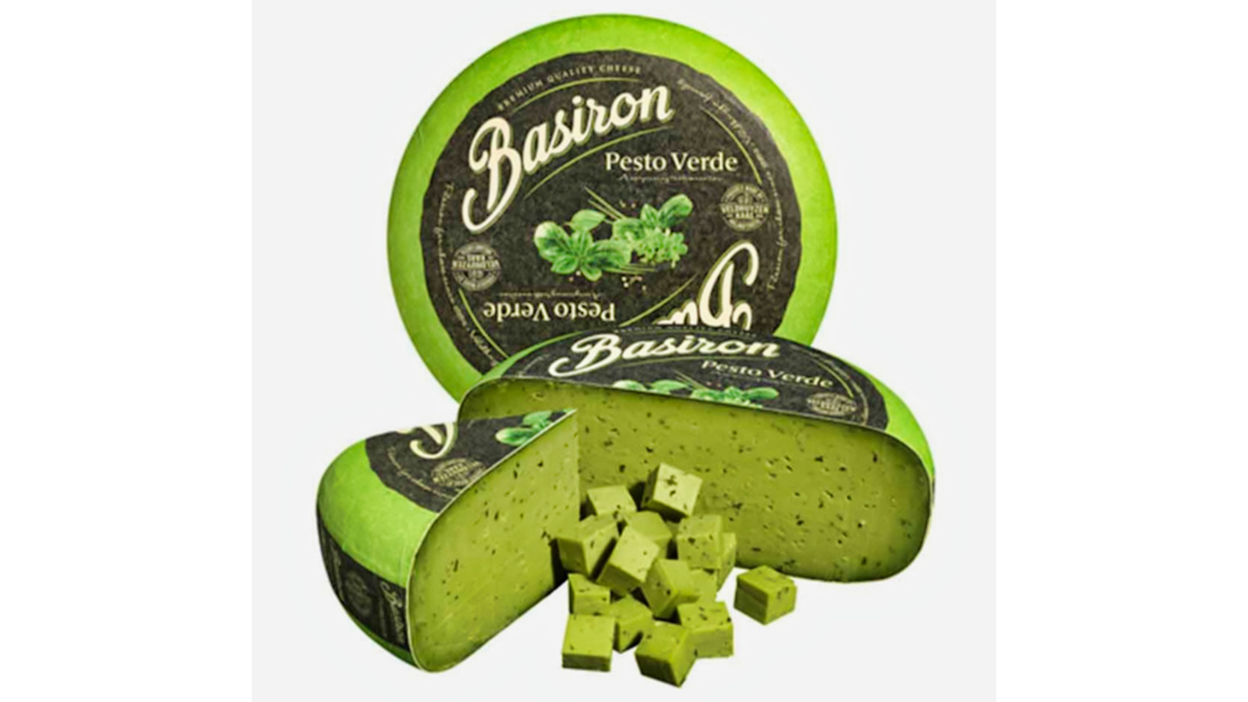Deliciosa mezcla de queso gouda con pesto verde. Ideal para buffet de quesos. Aporta color y sabor.